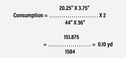 So, Consumption = (19” X 2.5”)/ (44” X 36”) X 2 = 95/1584” = 0.05” = 0.06 yd