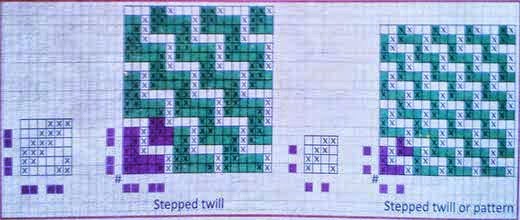 A 1:1 order of coloring with a 2/2 twill weave (for finer effect) or 1:2 order of coloring with a twill weave (for finer effect) or 2:1 order of coloring with a twill 3/3 weave (for coarser effect) gives a useful effect known as stepped twill. Its development is shown in the following figures.