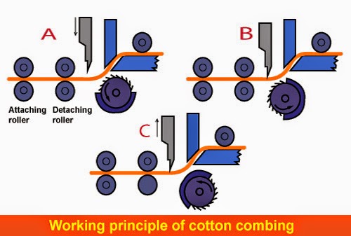 - When the cylinder comb completes its action, the top comb then comes down to perform its action at the back part of the fibre fringe. Meanwhile, the partly combed fibres are withdrawn through the top comb by detaching rollers.